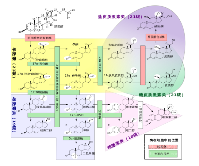 其实不然,这两种激素都称之为类固醇激素,它们的原材料都是胆固醇。在各种酶的作用下,胆固醇转变为孕激素(21碳),孕激素转变为雄激素(19碳),在芳香化酶的作用下,雄激素转变为雌激素(18碳)。