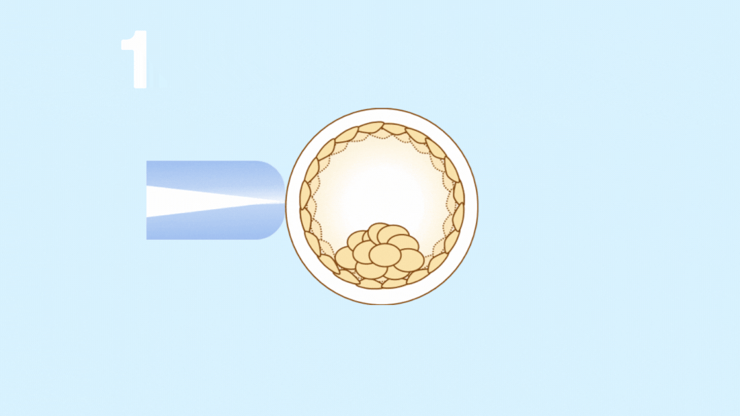 冷冻囊胚时,目前大多数使用玻璃化冷冻法,先将囊胚脱水,然后冷冻保存,囊胚融解时,囊胚处于脱水状态,透明带部分和内部细胞部分之间出现了较大的间隙,或者在囊胚的收缩期(皱缩期),这时用激光切割透明带可以避免损坏内部细胞。