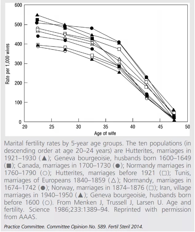 2014年发表在Fertil Steril的研究调查结果显示,女性超过35岁后,生育力快速下降。当女性年龄达到45岁时,生育力处于一个很低的水平。