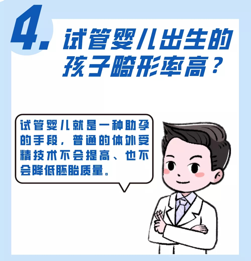 大数据显示试管婴儿技术出生的胎儿总体而言与正常人群发生先天异常的比例相似,有些特殊先天异常的疾病发生率的确高于正常人群,但更多的原因应归于遗传背景,比如严重少弱畸精子症,而非源于试管婴儿技术本身。