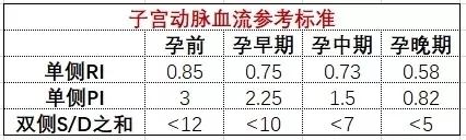 子宫动脉血流的参数包括搏动指数(PI)、阻力指数(RI)、收缩期峰值流速/舒张期流速(S/D)。