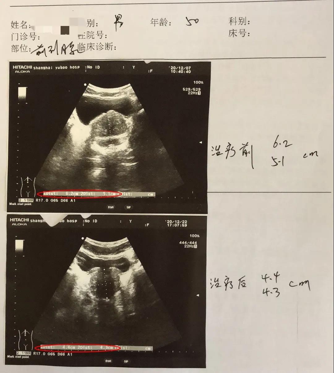 (患者治疗前前列腺大小为6.2cm×5.1cm,治疗后大小减小为4.4cm×4.3cm)