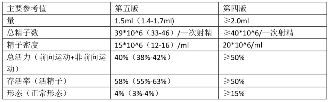 精液常规分析参数是评估男性生育力的重要指标,在《WHO人类精液实验室检验手册(第五版)》中,相对第四版,精液质量部分参考值有如下变化: