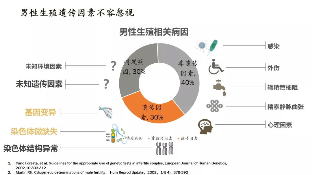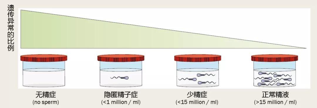 1.非梗阻性无精子症和重度少精子症:精子遗传异常的比例随着精子浓度的降低而升高,在精子数<5*106/mL的不育男性中,遗传异常的发生率是正常男性的10倍;Y染色体微缺失占无精子症患者比例约为10%。