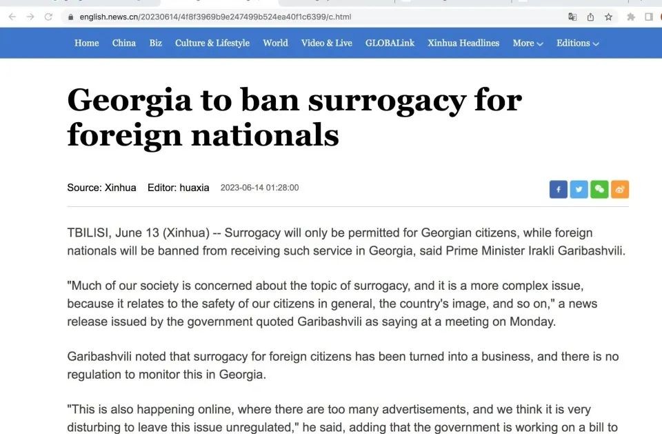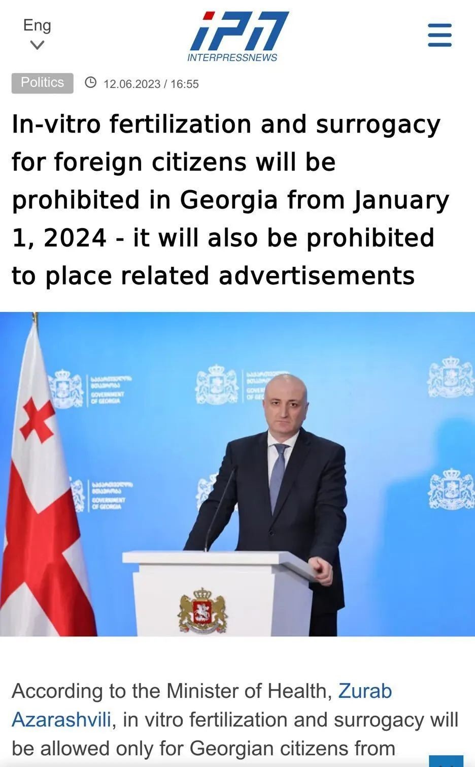 2023年6月12日格鲁吉亚InterpressNews报道最新信息显示2024年1月1日起,格鲁吉亚将禁止外国公民体外受精和代孕,也将禁止投放相关广告。