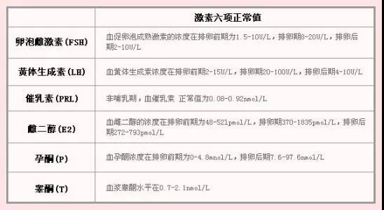 性激素六项分别为卵泡刺激素(FSH)、黄体生成素(LH)、雌激素(E2)、孕激素(P)、雄激素(T)、泌乳素(PRL)。能反应卵巢年龄的是前三项,其他几项则是反映女性体内其他内分泌状况。测定时间为月经的第2-5天,其中基础FSH水平升高提示卵巢储备功能下降。
