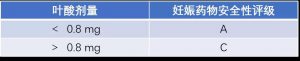 当>0.8 mg时,则为C级,表明在动物实验显示>0.8 mg的叶酸能造成胎仔畸形或死亡,但无妇女对照研究,使用时必须谨慎权衡药物对胎儿的潜在危险。