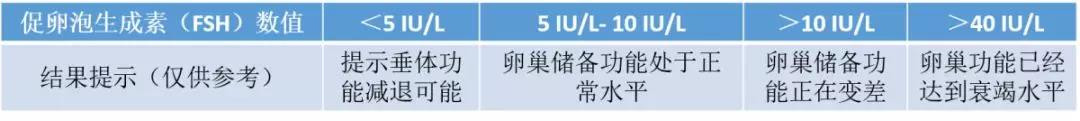 促卵泡生成素一定程度上反应了卵巢储备功能。其数值的参考标准如下所示: