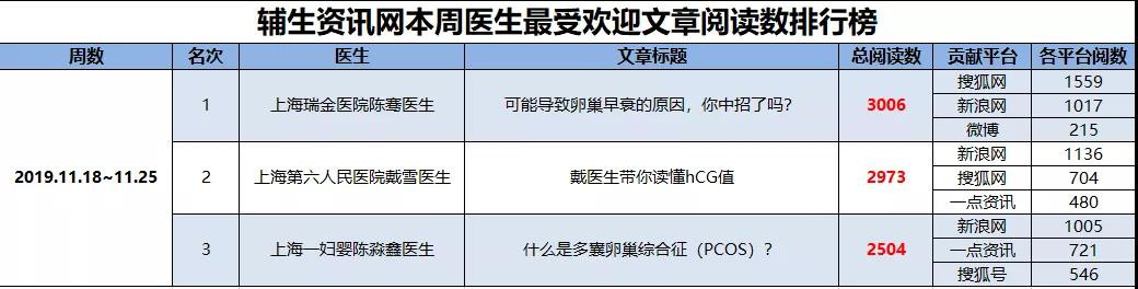 数据统计自辅生资讯网repodNews全媒体平台2019年47周(2019年11月18日~11月25日),小编统计了在过去一周时间里辅生资讯网全媒体平台阅读率最高的前三甲医生科普文章,最受欢迎的本周生殖科普达人医生为: