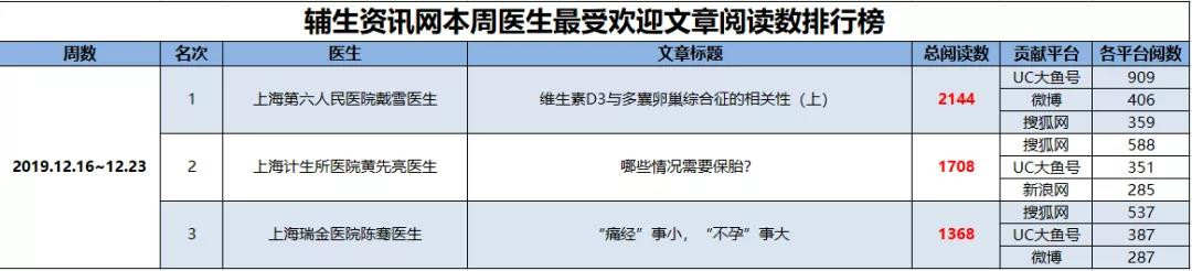 辅生资讯网第51周最受欢迎医生文章排行榜