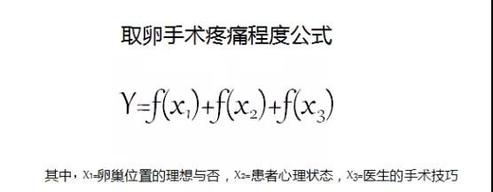 关于取卵手术疼痛的话题,我在以前的《生殖科那些事儿之手术室风云》里曾经提到过,这里再简单复习一下,如果我们把疼痛感作为因变量Y,那可以用一个简单的公式总结一下疼痛感的产生: