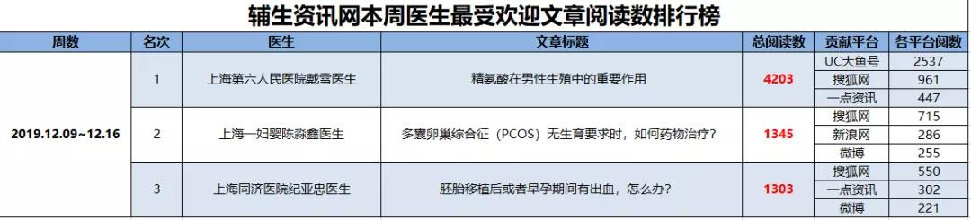 数据统计自辅生资讯网repodNews全媒体平台2019年50周(2019年12月09日~12月16日),小编统计了在过去一周时间里辅生资讯网全媒体平台阅读率最高的前三甲医生科普文章,最受欢迎的本周生殖科普达人医生为: